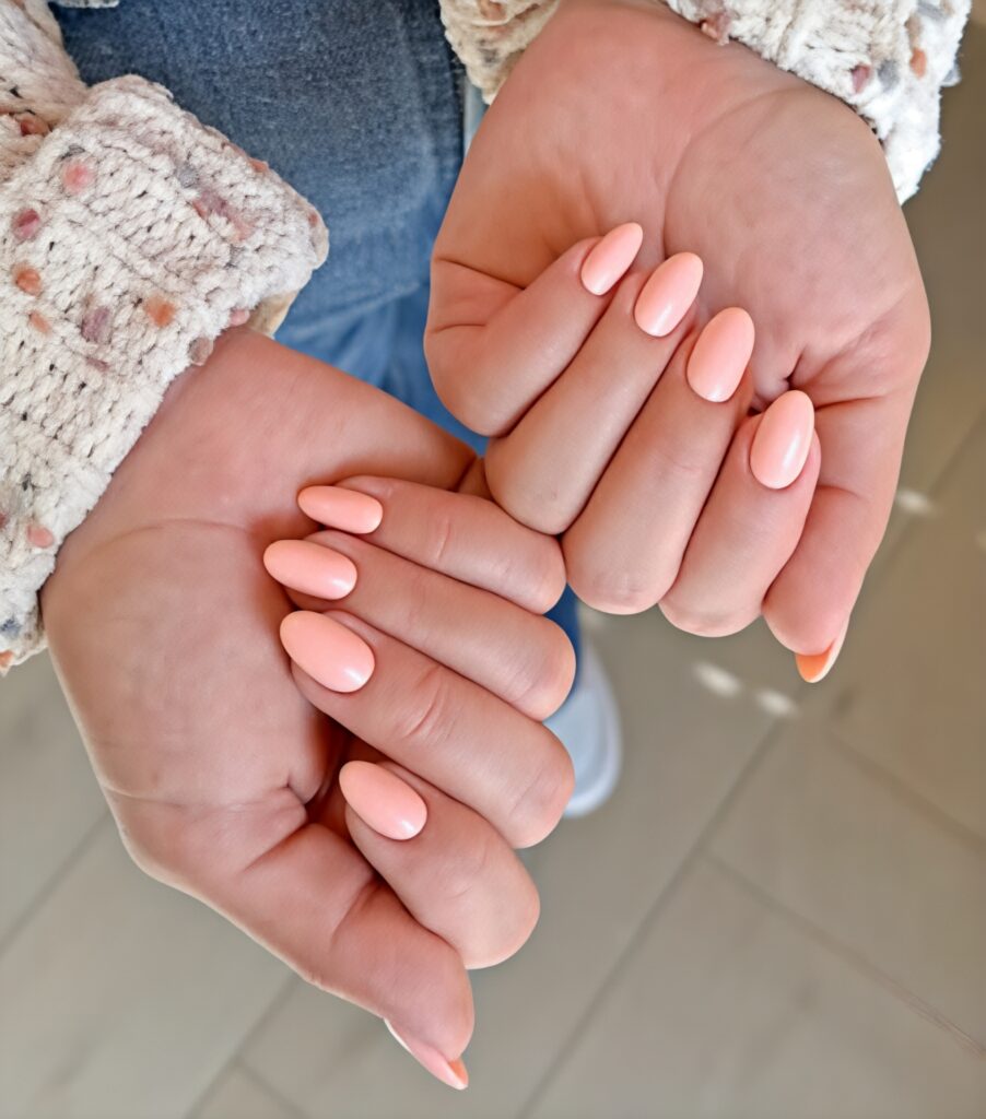 Peach nails are soft warm and perfect for sunny days. This color reminds us of fresh peaches and summer fruits. It gives a fresh and happy feeling whenever you look at your hands. Peach is brighter than nude but softer than orange so it looks balanced and beautiful .This shade is great for daily wear because it matches almost every outfit.
