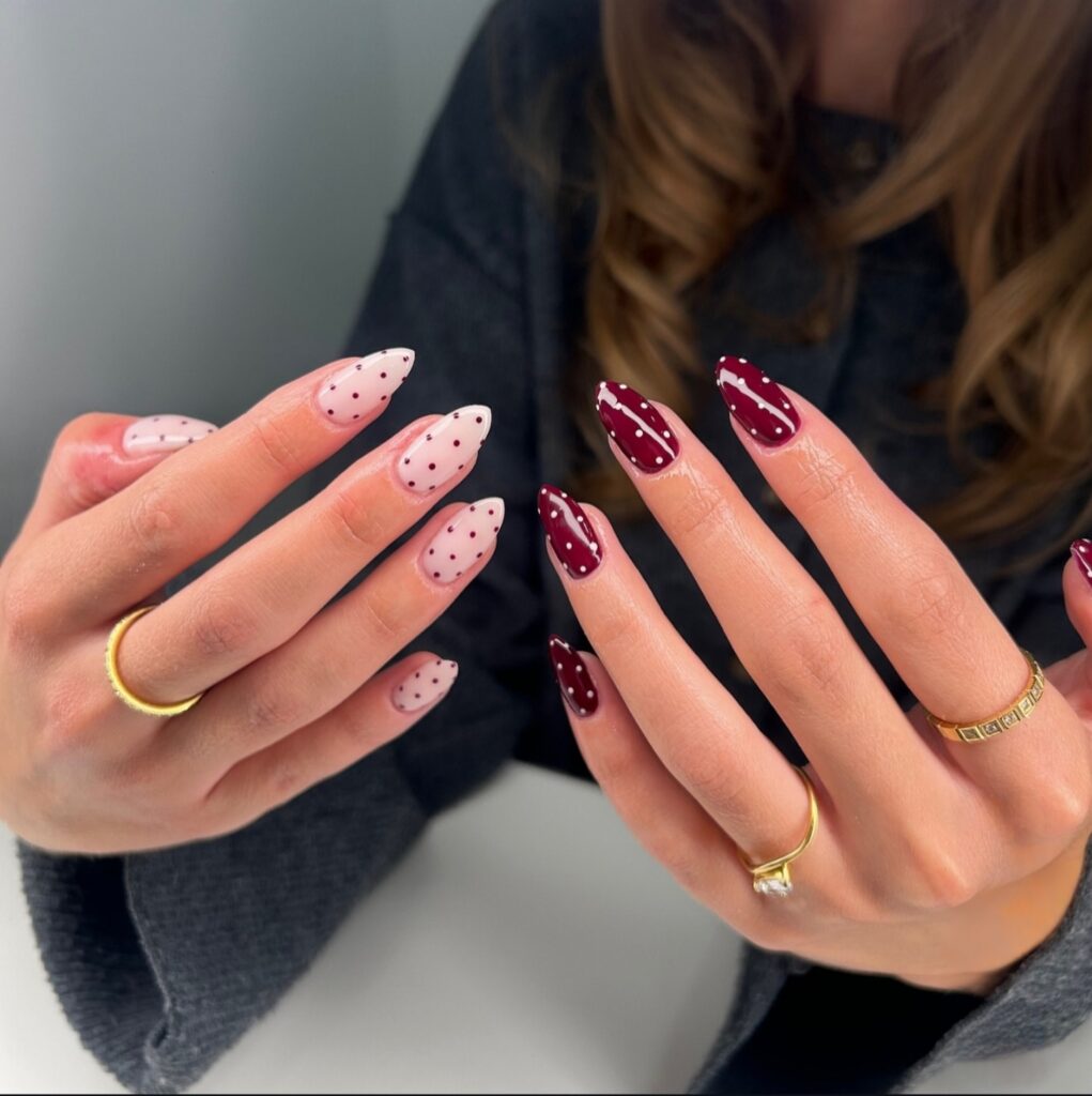 Polka dot nails are fun and playful. Small dots on a light background look very cute. You can choose black dots on white white dots on red, or any color combination you like. This design is simple and easy to make at home. You can use a toothpick to create tiny dots. Polka dots give a cheerful and young vibe. They are perfect for summer picnics and casual days. If you like cute and easy nail art, polka dot nails are a great idea.