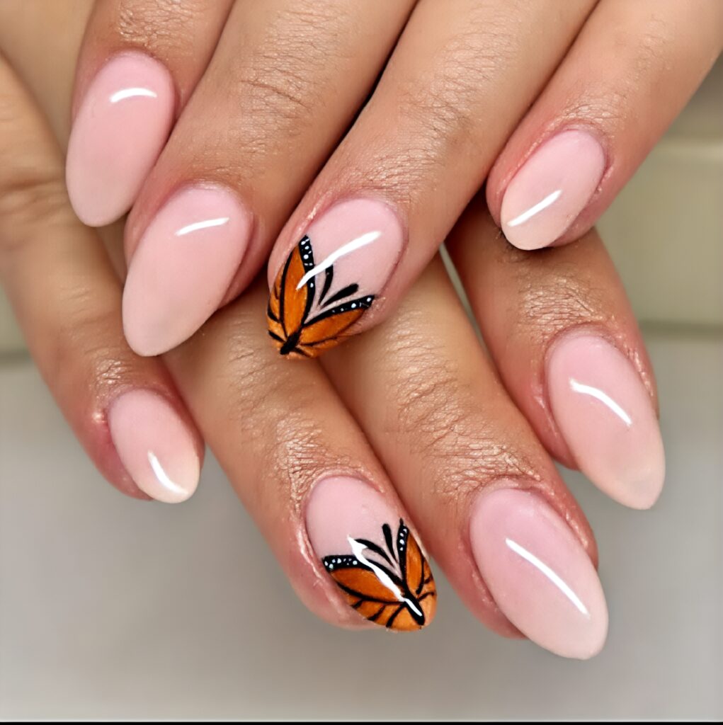 Butterfly nails look soft, dreamy and very pretty. Butterflies remind us of gardens, flowers and warm summer days. You can paint small butterflies on one or two nails and keep the rest simple. Pastel backgrounds like pink, lavender or blue look best with butterfly designs.