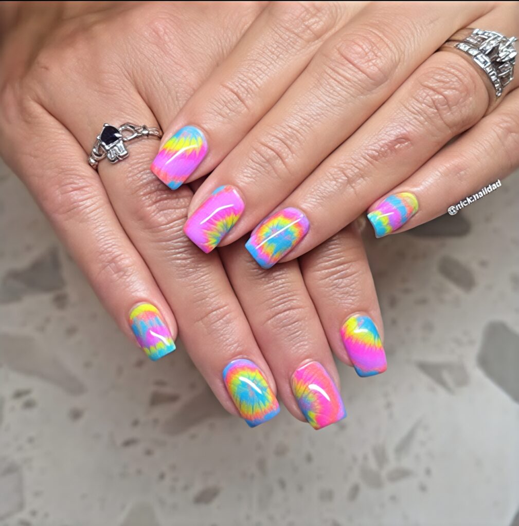 Tie-dye nails are colorful and creative. This design mixes different shades in a soft swirl pattern. In summer, pastel tie-dye looks the best because it is colorful but still gentle. You can use pink, blue, yellow and purple to create a soft blended look. Each nail can look slightly different which makes it unique and fun. Tie-dye nails show creativity and happy energy. They are perfect for vacations, festivals or fun days out. Even though the design looks detailed it still feels light and playful for summer.