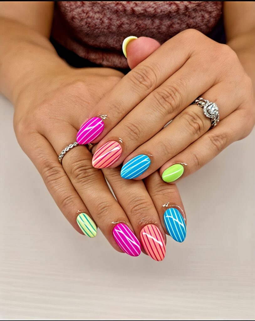 Neon nails are bright and bold. Colors like neon pink, orange and green stand out in summer sunlight. Even though neon is bright you can keep it casual by painting just one or two nails neon and others soft .Neon nails show confidence and fun personality. They are perfect for beach days and parties. If you love bold colors neon nails are a great summer choice.