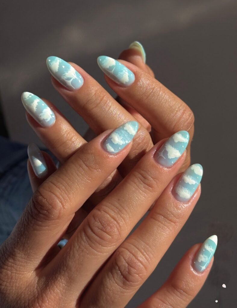 Baby blue nails with small white clouds look soft, dreamy and very peaceful. This design reminds us of clear summer skies and slow happy days. When you look at your nails it feels like you are looking at the sky. The light blue color gives a cool and refreshing feeling which is perfect for hot summer days. You do not need heavy designs for this look. Just paint your nails baby blue and add tiny white clouds on one or two fingers. It looks cute and creative without being too much. This design is perfect for school, college or even a picnic with friends. It gives calm, sweet and happy summer vibes.
