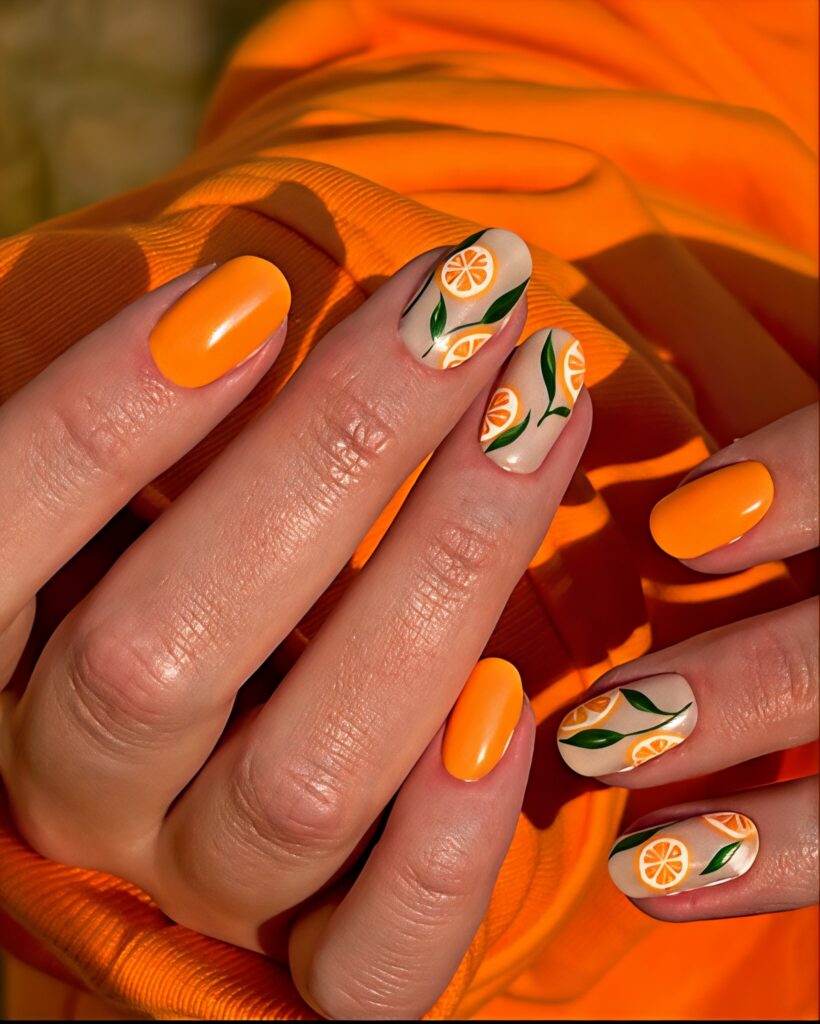 Fruit slice nails look juicy and fun. You can paint tiny oranges, lemons or kiwis on your nails. This design is playful and perfect for summer. You do not need to paint fruit on every nail. Just one or two fruit designs look cute enough. It gives a fresh and happy vibe. Fruit nails are great for vacations and fun outings.