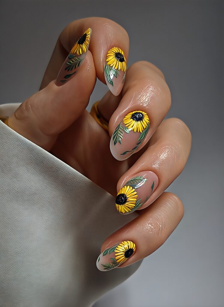 Sunflower nails are bright and full of positive energy. Sunflowers remind us of sunshine and happiness. A small sunflower design on a light base color looks very cute.You can keep most nails plain yellow or nude and add sunflower art on one nail. This keeps the look simple and balanced. Sunflower nails are perfect for summer vacations and outdoor events. They make you feel cheerful and confident.