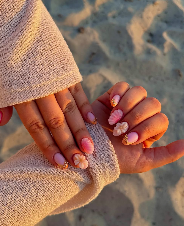 Even one small flower on each nail looks very pretty. You can use a soft base color like pink, lavender or nude and add flowers on top. Floral nails are perfect for vacations birthday parties and casual days. They give a happy and girly vibe. If you love nature, floral nail art is a perfect summer choice.
