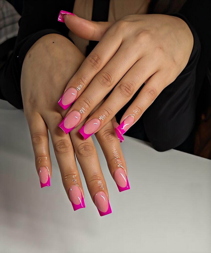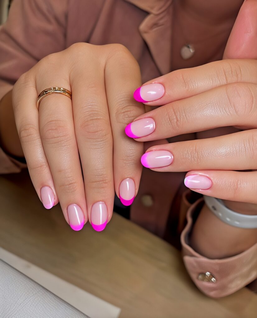Different shades of Pink French tips are simple but stylish. Instead of white tips you use pink color on the nail edges. The base stays nude or light pink. This design looks classy and neat. It is perfect for weddings, college or daily wear. It gives a soft and elegant look. If you want something simple but trendy pink French tips are a very good choice for summer.