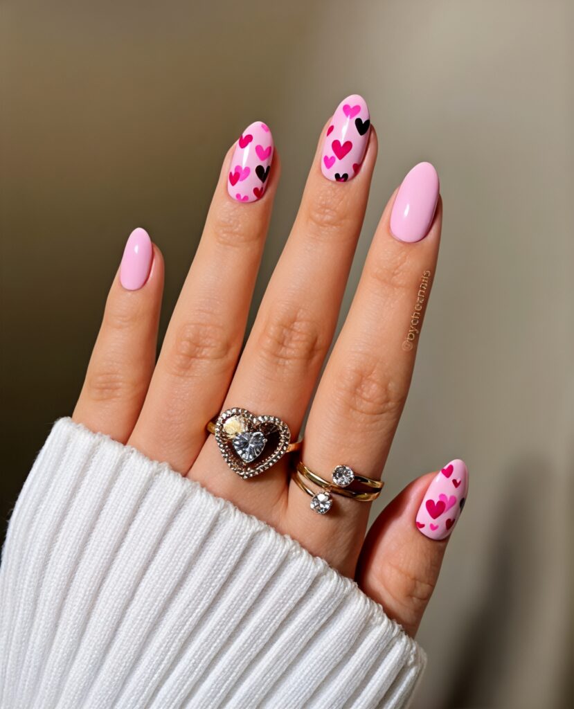 Pink heart nails look cute and sweet. Small hearts on pink base give lovely feeling. You can draw tiny red black and pink hearts. This design is perfect for dates, birthdays or fun days out. It looks playful and romantic. If you love cute and girly style heart nails are perfect. They make your nails look adorable and full of love.