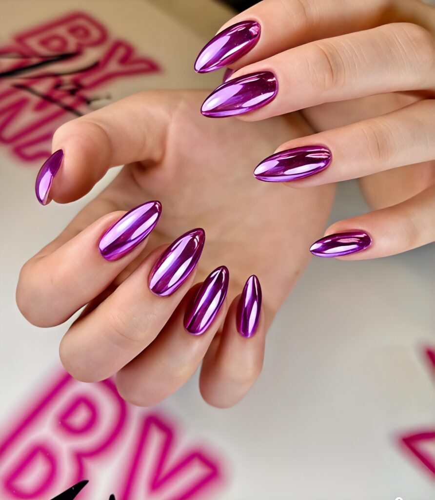 Pink chrome nails look shiny like a mirror. They reflect light and look very stylish in sunlight. This design is perfect for girls who like modern and trendy styles. Chrome pink looks beautiful on long and short nails both. It gives a smooth and glossy finish. You can wear it at parties or special events. These nails look bold but still very classy and attractive.