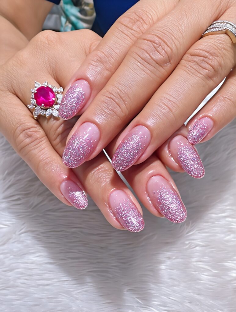 Rose pink glitter fade nails look soft and shiny. The glitter starts heavy at the tips and slowly fades down. This creates a smooth and beautiful effect. It shines nicely in sunlight and looks magical at night. This design is perfect for parties or special dinners. It feels elegant but still fun. If you love sparkle with a soft touch this nail idea is just right for you.