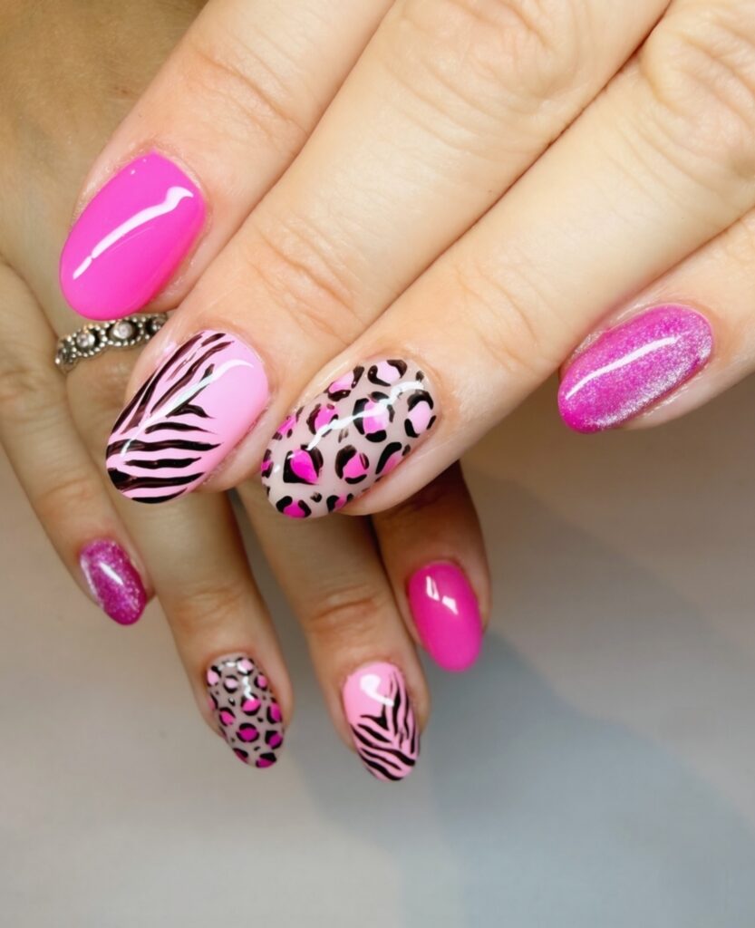 Pink animal print nails look bold and trendy. You can try leopard or zebra patterns on a pink base. This design is fun and full of attitude. It is perfect for girls who like strong fashion style. You can keep one accent nail with print and others plain pink. Animal print makes your nails look wild and stylish for summer days.