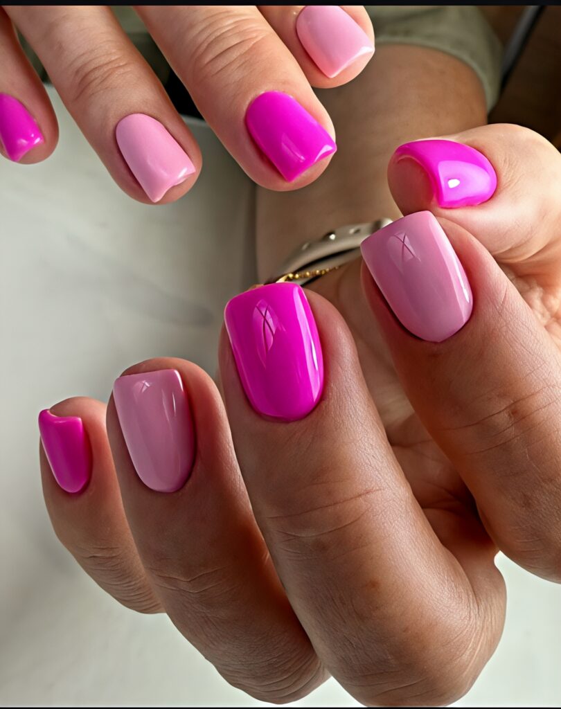 Two tone pink nails use two different pink shades together. You can paint half nail light pink and half dark pink. This design looks modern and stylish. It is simple but different from plain nails. Two-tone nails are perfect for summer because they look fresh and creative. If you like trying new styles this design will make your nails look unique and trendy.
