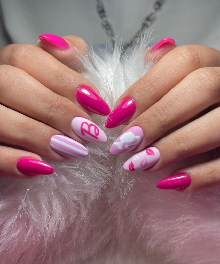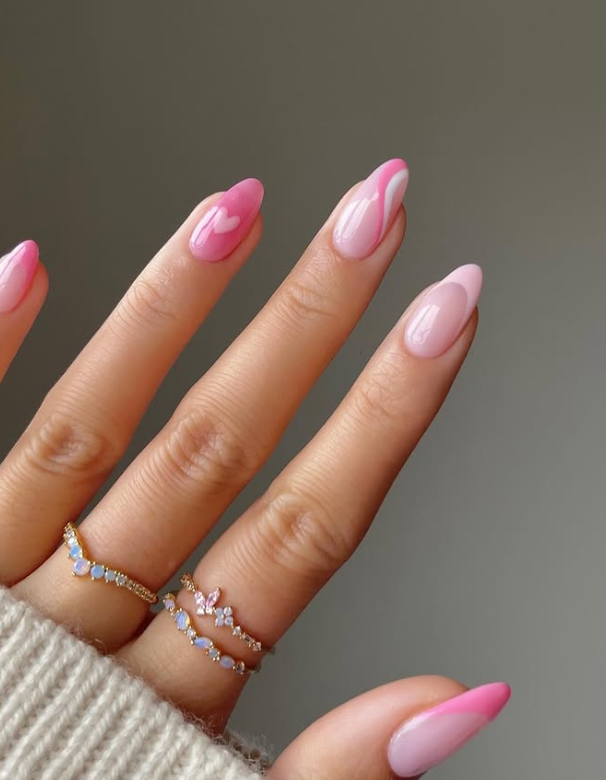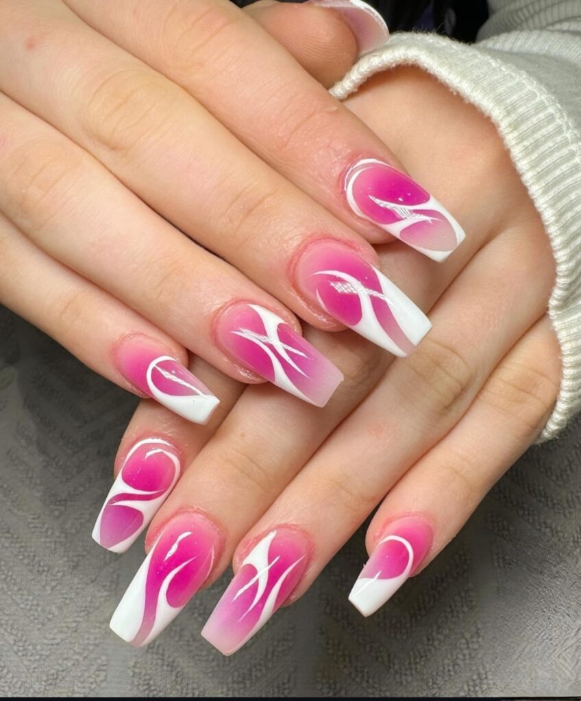 Pink and white swirl nails look soft and artistic. The swirl lines create a smooth and flowing design. It feels modern and trendy. This style is perfect for summer because it looks light and fresh. You can choose ombre pink or hot pink for the base. Swirl nails are simple but still look creative and stylish.