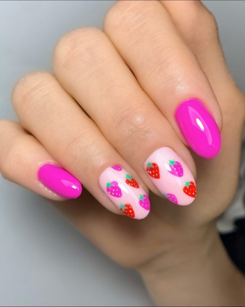 Strawberry pink nails are cute and fun. You can draw tiny strawberries on a pink base. This design feels playful and perfect for summer vacations. It looks great with casual outfits and picnic looks. The small red and green details make the nails look creative. If you like fruity and cheerful designs strawberry pink nails are a sweet and happy choice.