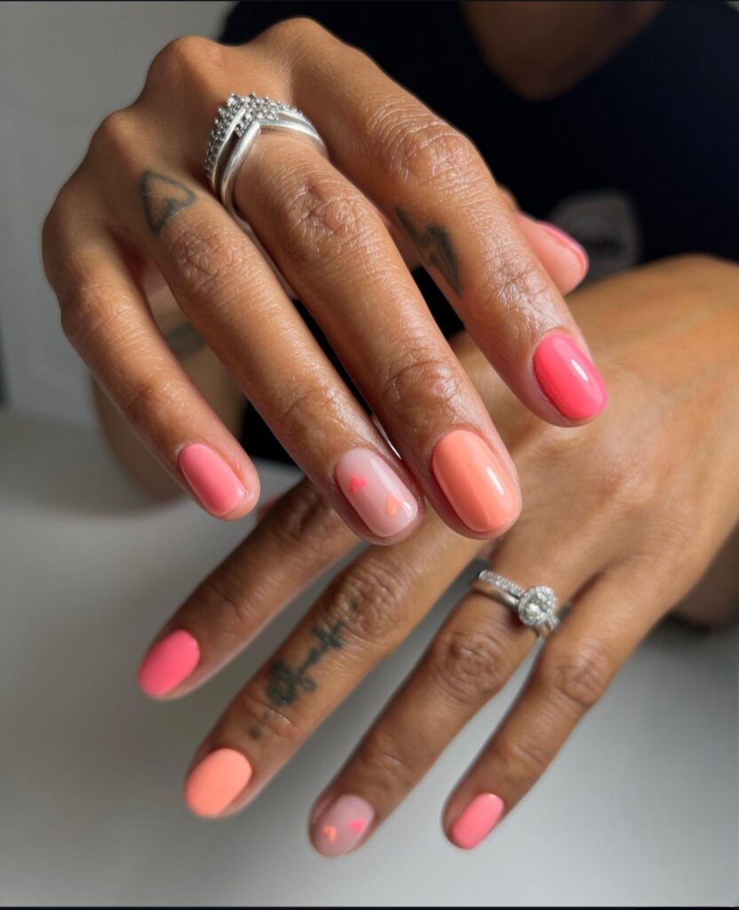 Pink rainbow nails use different pink shades on each finger. One nail can be baby pink, another hot pink and another peach pink. This makes your hands look colorful but still matching. It feels fun and creative. This style is perfect for summer vacations and beach days. If you love variety and cannot choose just one shade this design is a happy and playful option.