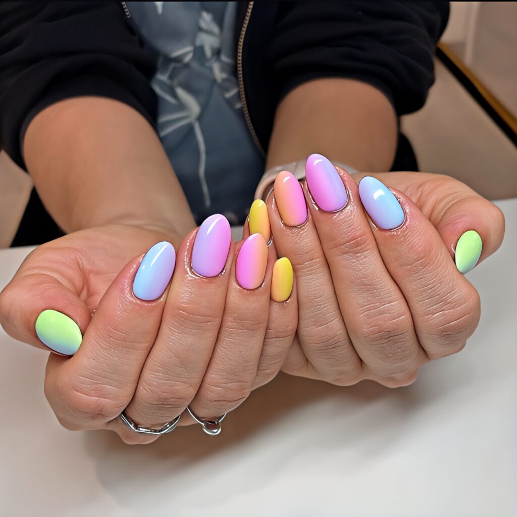 Rainbow nails use different colors on each nail. This design looks playful and bright during summer days. On short nails soft pastel rainbow shades look especially cute. You can paint every nail a different color for a fun effect. It is simple but very eye-catching. This idea is perfect for people who love colors and want something cheerful and unique.