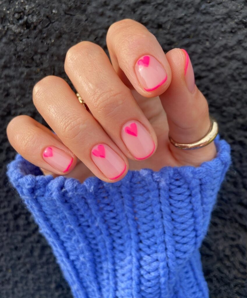 French tip Neon pink nails are bold and bright. This color stands out and grabs attention quickly. On short nails, neon pink looks trendy and stylish. You can keep it simple or add a small heart design. This shade is perfect for summer parties and fun outings. It gives strong and confident vibes to your overall look.