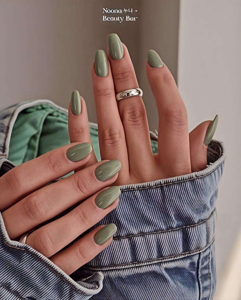 Olive green pastel nails feel fresh, cold and soft almost like mint candy. The color is trending during spring and summer because it looks light and cheerful. I once wore mint nails during a picnic and they matched perfectly with my outfit and the outdoor vibe. This shade gives confidence without being bright or heavy making it perfect for college, outings and festivals.