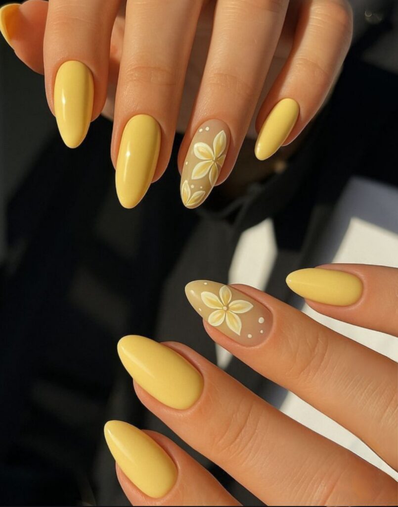 Baby yellow pastel nails feel like sunshine but softer. The color reminds me of spring flowers and morning light. When I tried this shade with little flower in one finger my hands looked brighter and more cheerful. It is a great choice for summer outfits and vacations. Baby yellow pastel nails spread good vibes without being too bright. Its perfect for anyone who likes light colors with a touch of positivity.