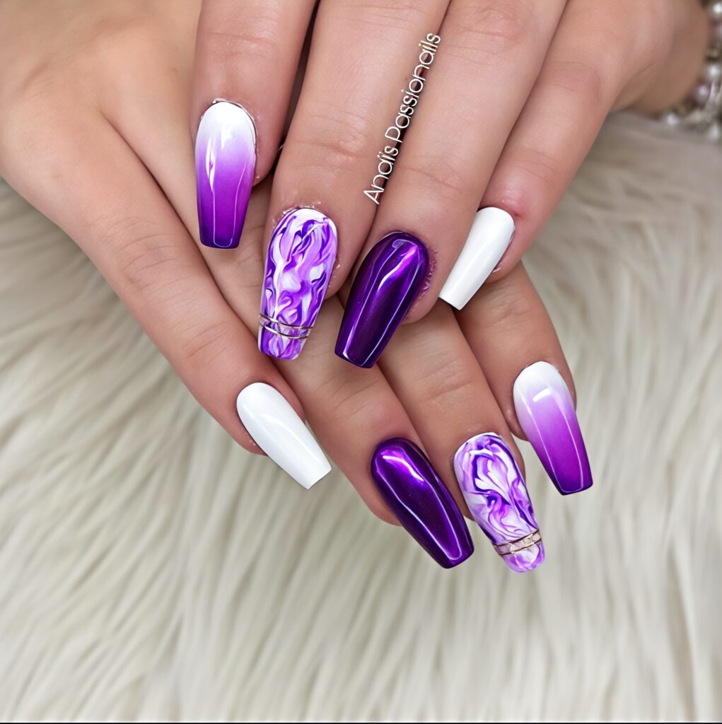 Purple rain nails blend light and dark purple shades together. The ombre effect looks smooth and beautiful. Adding marble design on one or two nail for modern and creative. It feels artistic and unique. This style is great for girls who love something different from simple nail art. The mix of shades gives a magical look like a soft purple sunset after rain.