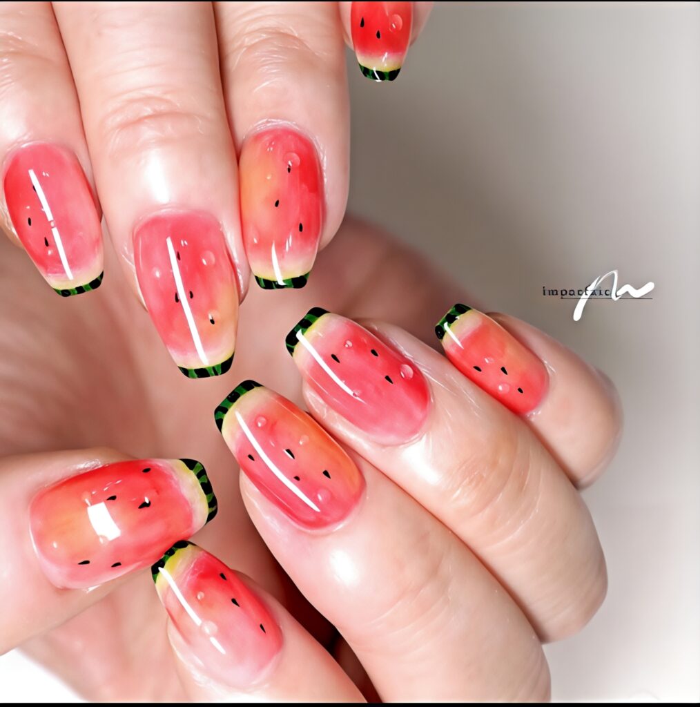 Watermelon nails are bright pink and green with tiny black seeds. They look just like fresh watermelon slices. This design feels juicy and full of summer energy. It is perfect for beach days and sunny weather. You can paint one watermelon design or decorate all nails. These nails are playful, colorful and very cute. They will definitely make your hands look fun and fresh.