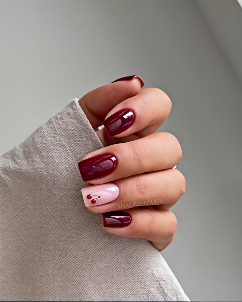 Cherry noir nails mix deep red and black shades. They look bold, stylish and a little dramatic. Adding tiny cherry designs makes them cute but still classy. This design is perfect for evening events or special dinners. It is different from light summer colors but still very trendy. If you like dark shades with a sweet touch cherry noir nails are perfect for you.