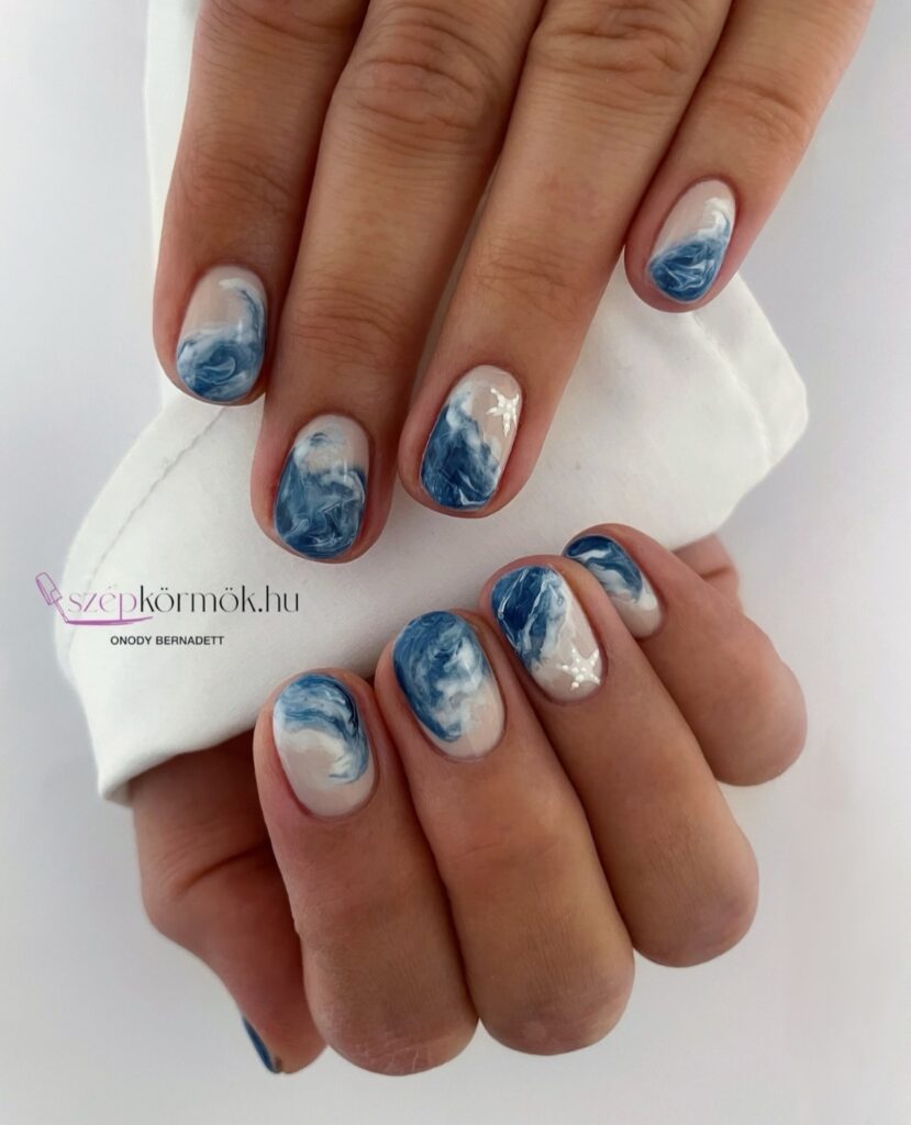 This design feels calm and classy. The nude base keeps the look simple while navy and white waves add a cool ocean touch. It looks like sea waves moving softly on the shore. This style is perfect for beach lovers. It is not too bright but still very stylish. You can wear it on vacation or even daily. These nails give peaceful summer vibes and look clean and beautiful.