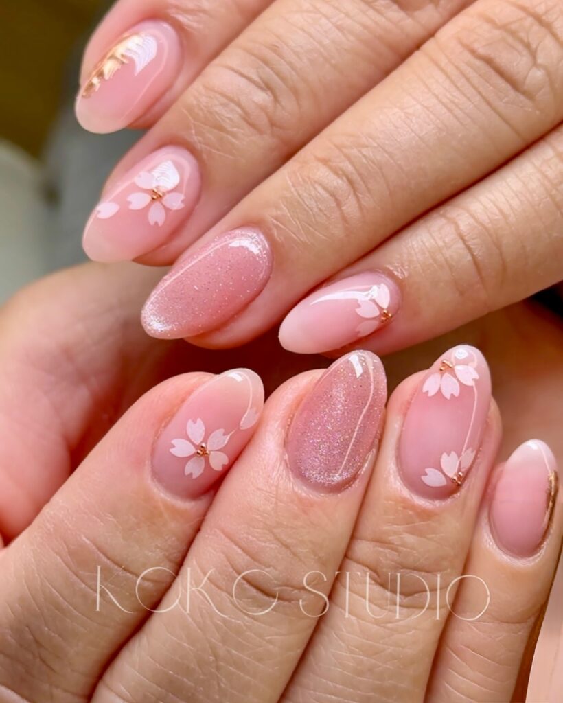 Soft pink nails with tiny cherry blossom flowers look calm and beautiful. This design feels light and sweet just like a peaceful spring morning. The small flowers add a gentle and elegant touch without looking too loud. It is perfect for girls who love simple but pretty nail art. You can wear this style at school, parties or even family outings. It makes your hands look neat, fresh and very graceful.