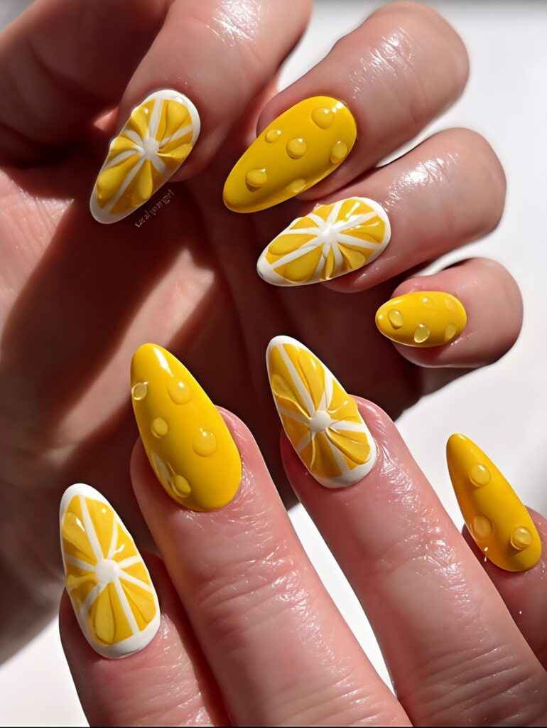 Bright yellow nails look like sunshine on your hands. Adding lemon slice designs in one or two nail makes them look fresh and juicy. This style is perfect for summer because it feels cool and cheerful. The almond shape makes your fingers look longer and stylish. If you love fruity and fun designs this one is for you. These nails will definitely grab attention and make you feel happy every time you look at them.