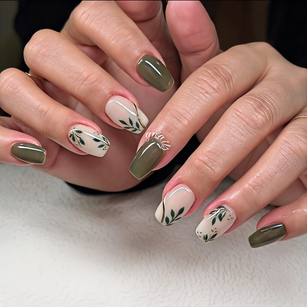Muted olive nails are calm, classy and modern. This soft green shade is not too bright but still looks stylish. It is perfect for people who love simple and clean designs. You can keep it plain or add tiny gold lines with leaf for extra beauty. These nails match almost every outfit. If you don’t like loud colors but still want something trendy muted olive minimal nails are a perfect choice.