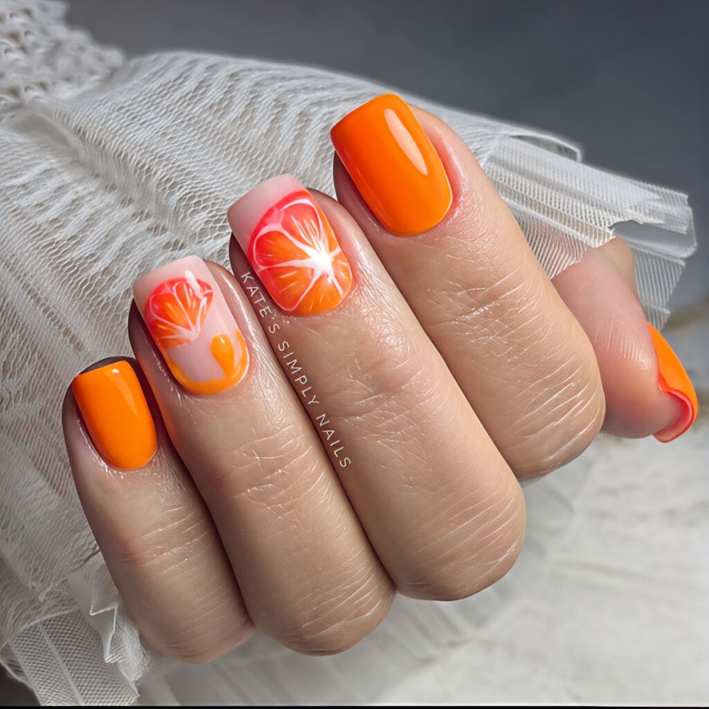 This design includes tiny fruit slices like oranges, kiwis and lemons. It feels fresh, colorful and full of life. Each nail can have a different fruit which makes it more fun. These nails are perfect for beach trips and summer picnics. They look cute and playful. If you love fruity drinks and summer snacks you will definitely love this bright and happy nail style.