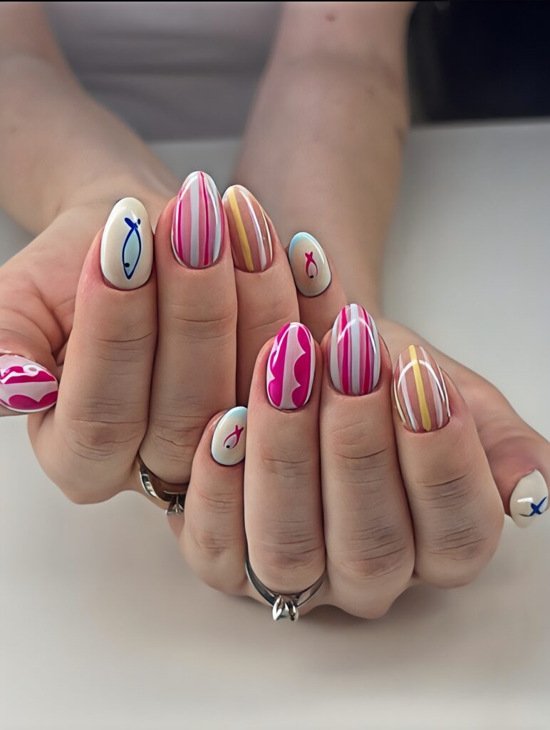 8. Pastel Paradise: Striped and Fish Accent Summer Gel Nails
