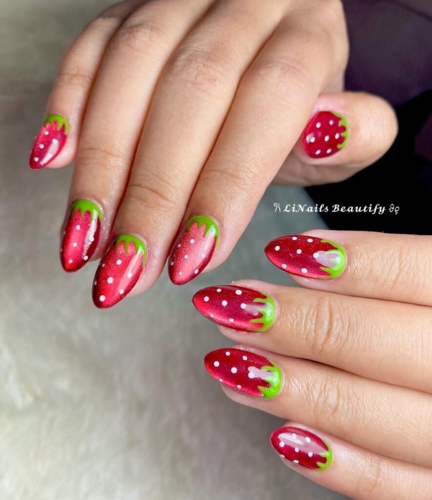 Strawberry nails are cute, sweet and fun. A red base with tiny white seeds and green leaves makes them look real and playful. This design is perfect for summer picnics and sunny days. You can paint strawberries on all nails or choose one accent nail. It gives a fresh and juicy look. If you love fruity designs and bright red colors strawberry obsession nails are a perfect summer choice.