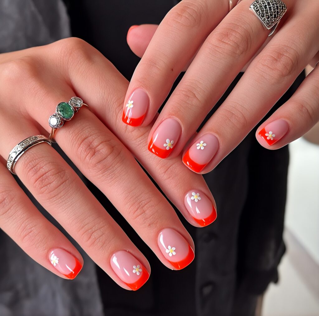 14. Orange-Tipped Almond Nails with Daisy Accents