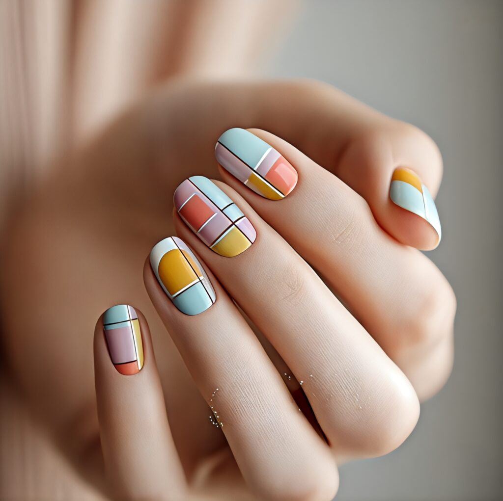 Geometric gelato nails use soft ice cream colors like mint, peach and lavender. Clean lines and shapes make the design look modern and creative. It feels playful but also neat. The pastel shades remind us of yummy summer ice cream. This nail art is perfect for girls who love both soft colors and cool patterns. It is different from floral designs and gives a stylish fresh summer vibe.