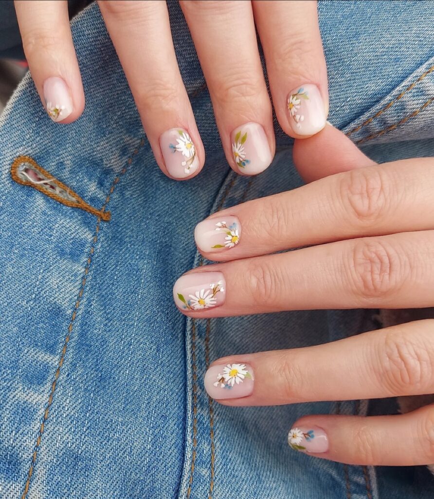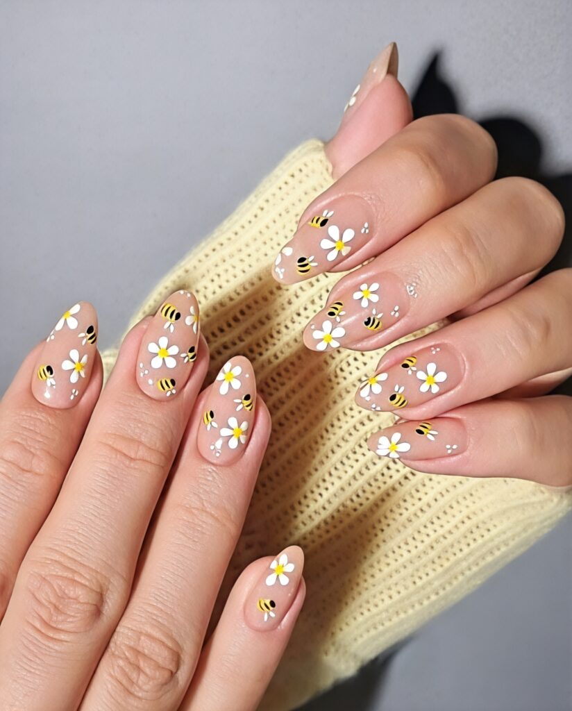 Nude nails look soft and sweet like morning sunshine. Adding tiny daisies and small bee designs makes them extra cute. This design feels natural and happy. It is perfect for garden lovers and spring summer time. You can keep most nails plain and decorate one or two nails for balance. These nails are simple but very charming and full of life.