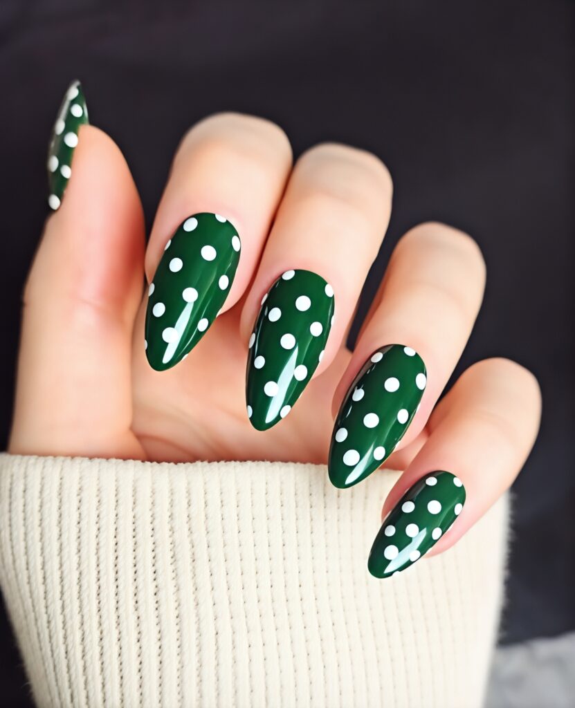 Green nails with tiny white polka dots look playful and fun. This design is simple but very eye catching. The dots add a cute and retro feel. You can choose light green for a soft look or dark green for a bold style. It matches well with summer outfits. If you like simple patterns that still stand out this polka dot nail art is perfect for you.
