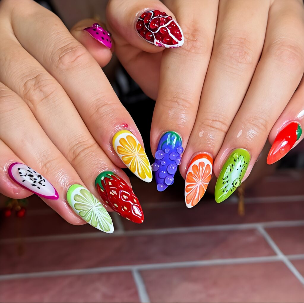 This design mixes fruits like watermelon and pineapple etc . The almond shape makes everything look elegant. Each nail can have a different fruits design which makes it more fun. It feels like a full summer vacation on your hands. This style is colorful creative and full of happy vibes. It is perfect for trips, holidays and fun summer days.