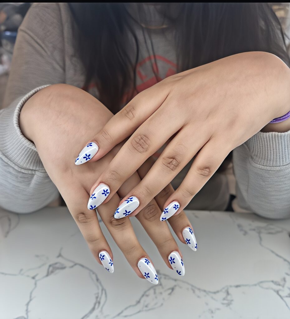 White nails with blue floral patterns look classy and artistic. The blue flowers give a soft traditional touch. This design feels calm and beautiful. It is perfect for girls who love detailed and neat nail art. The white base keeps everything clean and fresh. These nails look elegant and special without being too bright. They are perfect for summer events and family gatherings.