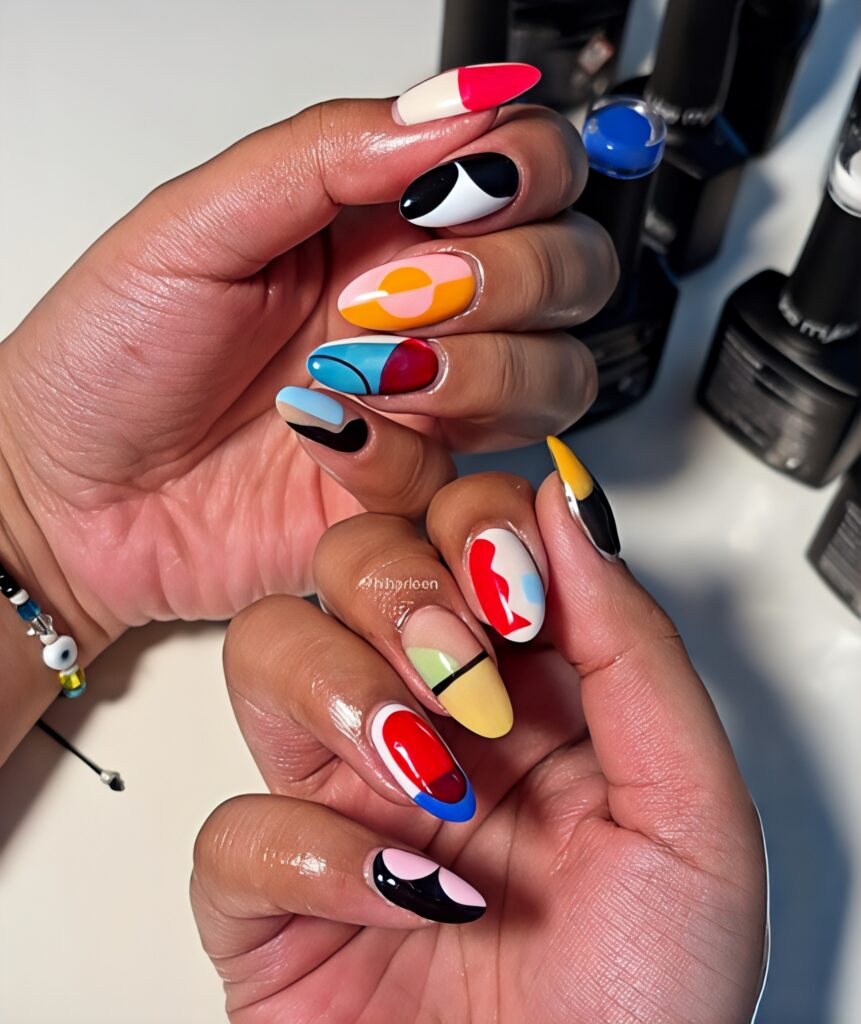 This design uses bright primary colors like red, blue and yellow. Abstract shapes make it look modern and creative. The oval shape keeps it soft and stylish. These nails are perfect for bold personalities who love art. The mix of colors makes them fun and eye catching. If you want something different from flowers and fruits funky abstract nails are a cool choice.