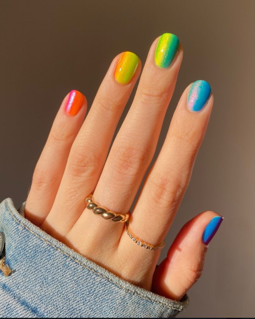 Retro rainbow dip nails use bright colors like red, orange, yellow, green and blue. The colors are placed in a soft blended style. This design feels fun and old school in a cool way. It is perfect for people who love colorful nails. The bright shades make your hands look lively and cheerful. These nails are great for parties and summer fun moments.