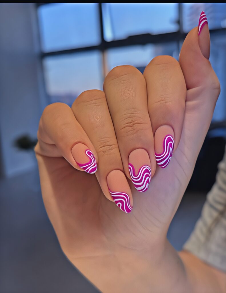 Electric pink nails are bold and full of energy. Adding wavy lines on nude base makes them look fun and modern. This design is great for girls who love bright colors and cool styles. The waves give a playful and creative look. These nails are perfect for summer parties and fun outings. If you want your nails to stand out and look different electric pink waves are a fantastic choice.