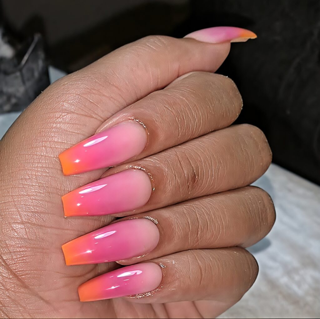 This nail design looks like a beautiful summer sunset. The colors slowly blend from orange to pink and then purple creating a soft ombre effect. To make it more magical a little dark blue or shiny glitter is added on top which looks like the night sky. This design feels dreamy and calm. It is perfect for evening events, beach vacations or summer photos. It gives warm and romantic vibes that many girls love.