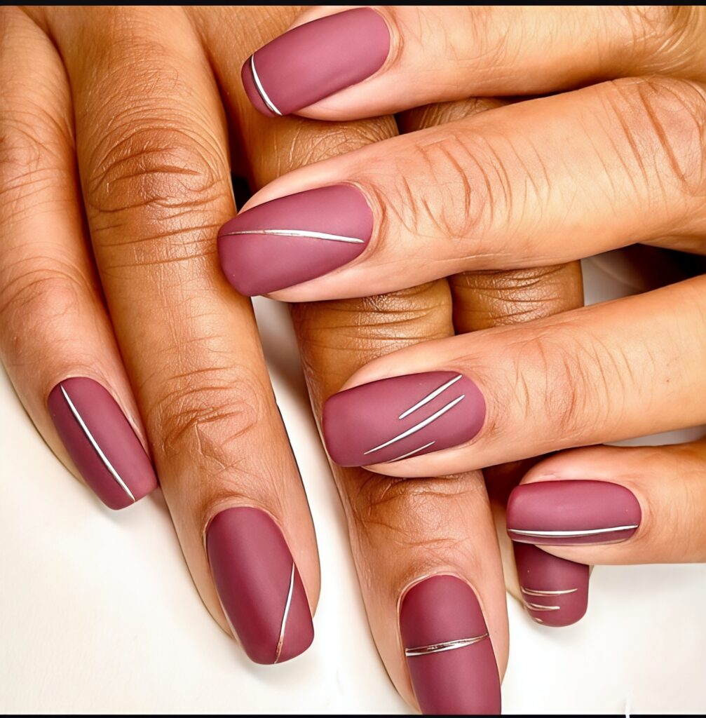 Dusty mauve is a soft purple and pink mixed shade that looks very elegant. In this design the full nail is painted in dusty mauve color. Thin white, black or gold lines are added in simple shapes to create a clean and modern look. This style is perfect for girls who love simple and classy nail art. It is not too bright but still looks stylish. You can wear it to school, college or family gatherings.
