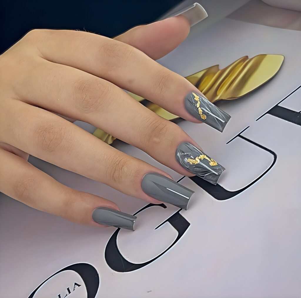 This design combines soft dusty grey color with shiny rose gold foil pieces. The grey base keeps the look calm and elegant, while the rose gold adds sparkle and shine. The foil looks like small broken glass pieces placed carefully on the nails. This style feels rich and modern without using very bright colors. It is perfect for evening functions, dinner dates or special occasions during summer.