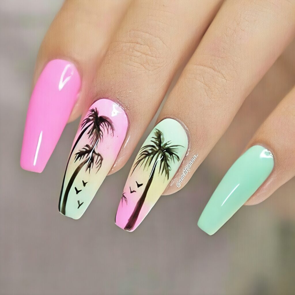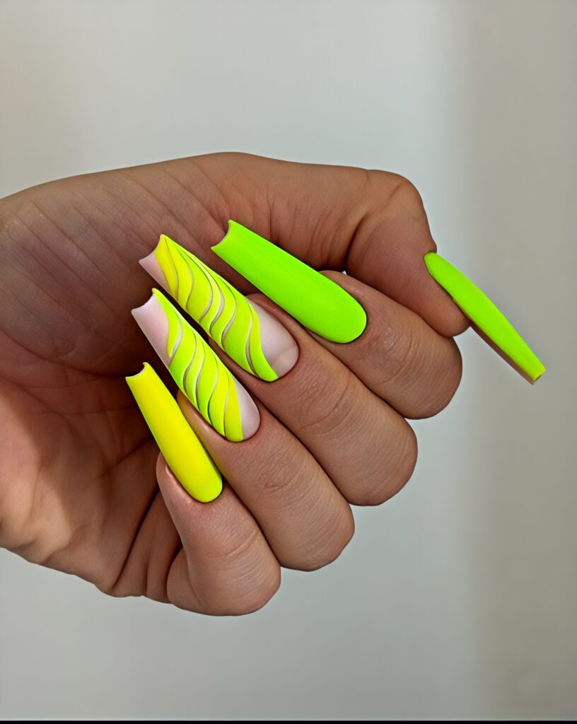 Neon colors are very trendy in summer. In this design bright neon shades like green, pink or orange are used as the base. Curve lines in one or two nail look attractive. The design make the nails look bold and fresh. This design feels happy and full of energy. It is perfect for beach trips, vacations and fun summer days with friends.