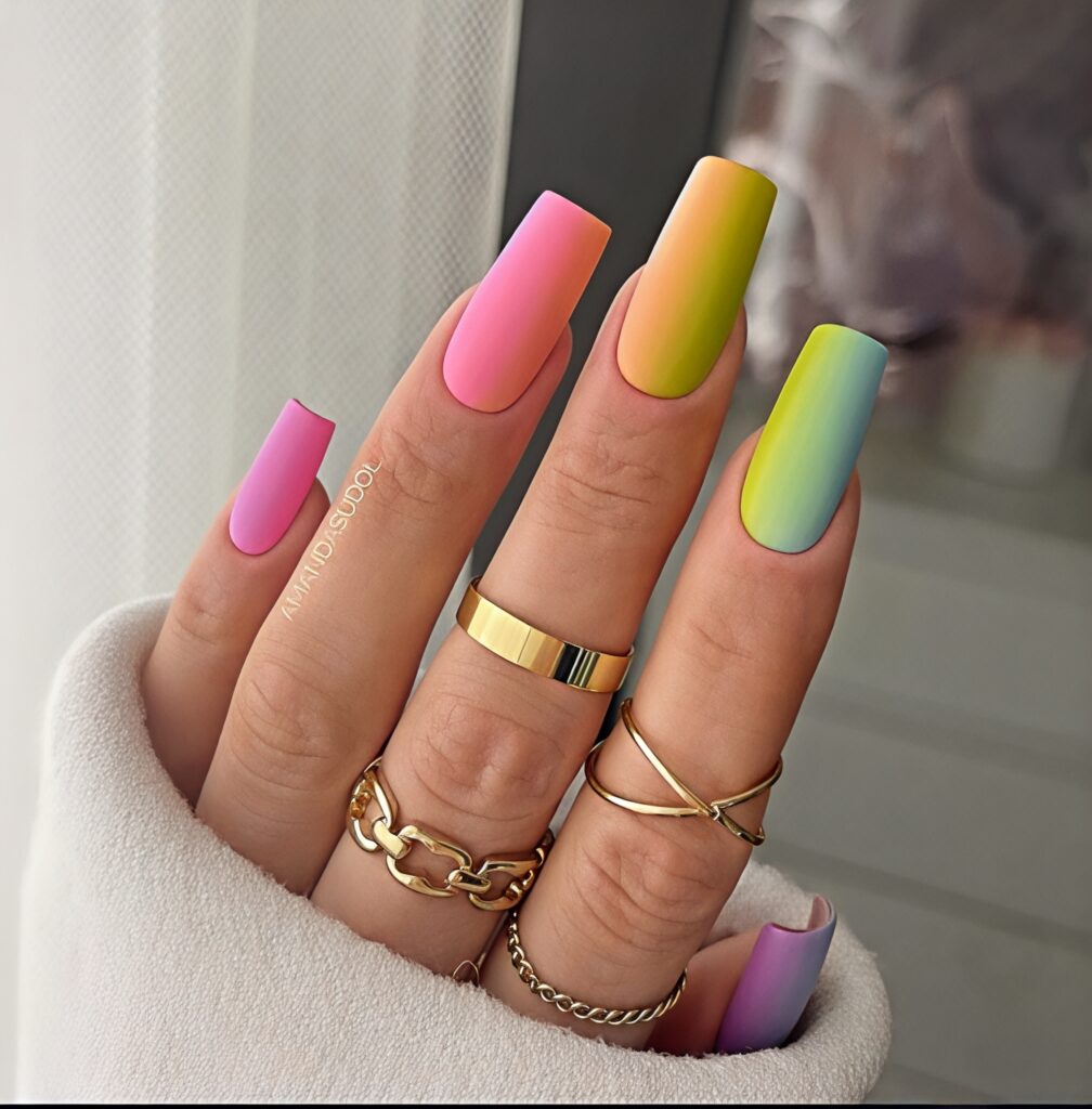 Matte Pastel rainbow fantasy nails look soft, dreamy, and magical. In this design, light shades like baby pink, mint green, soft yellow, lavender, and sky blue are used together. Each nail can have a different pastel color or a soft rainbow blend. The matte colors are not too bright, so they look calm and sweet. This design is perfect for summer because it feels light and cheerful. It is great for school holidays, day outings, and cute Instagram pictures with friends.