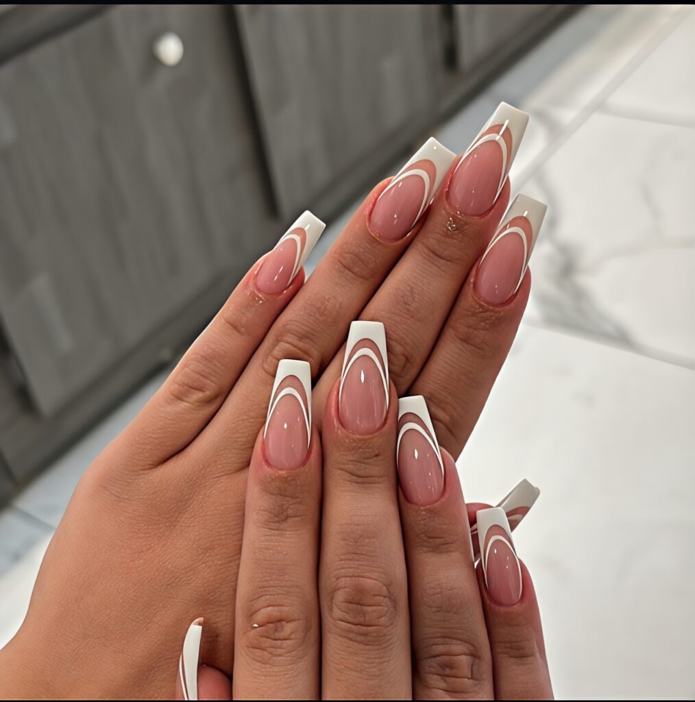The chic double French design is a modern version of the classic French manicure. Instead of one line at the tip two thin curved lines are drawn. These lines can be white, neon or even glittery. The base is usually nude or light pink. This style looks very neat and stylish. It is simple but still creative. It is perfect for girls who like clean designs with a small twist for summer fashion.