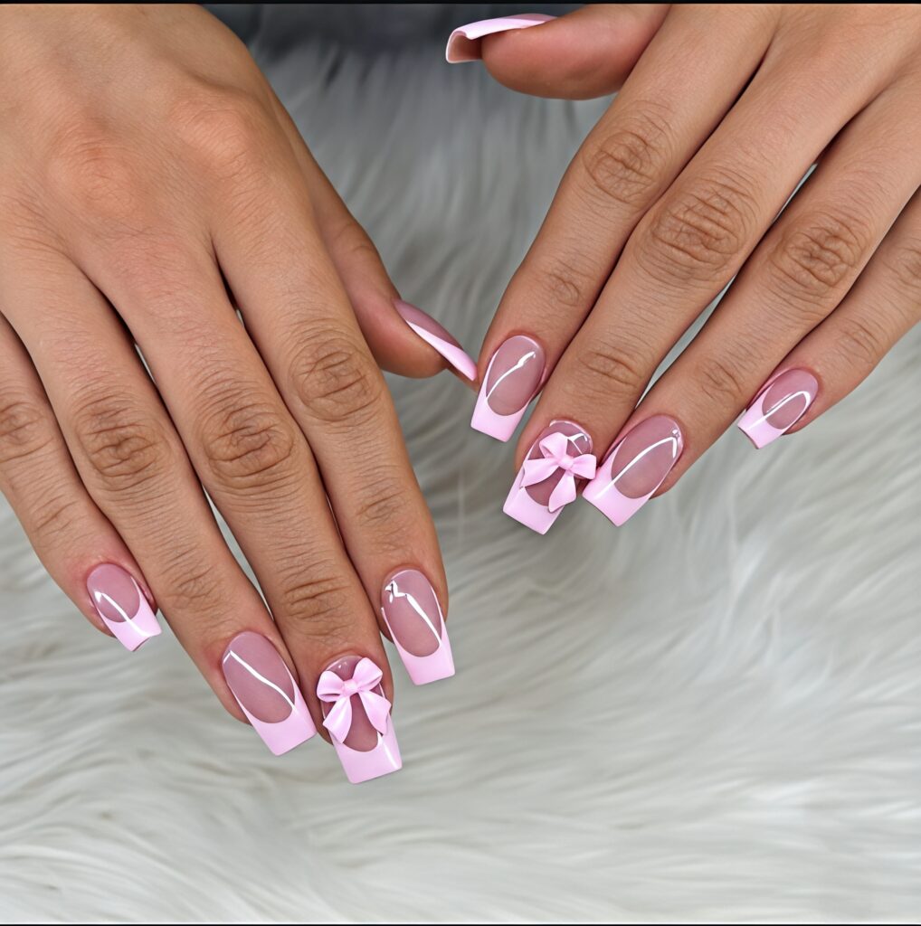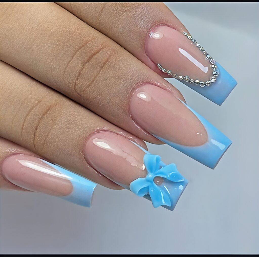 Baby blue ribbons and pearls nails look soft, cute and elegant. The base color is light baby blue which feels calm and fresh. Small ribbon designs or tiny pearl decorations are added on one or two nails. This makes the design look sweet and classy. It is perfect for summer weddings , birthday parties or special family events. If you like soft and girly styles this nail design is a beautiful choice.