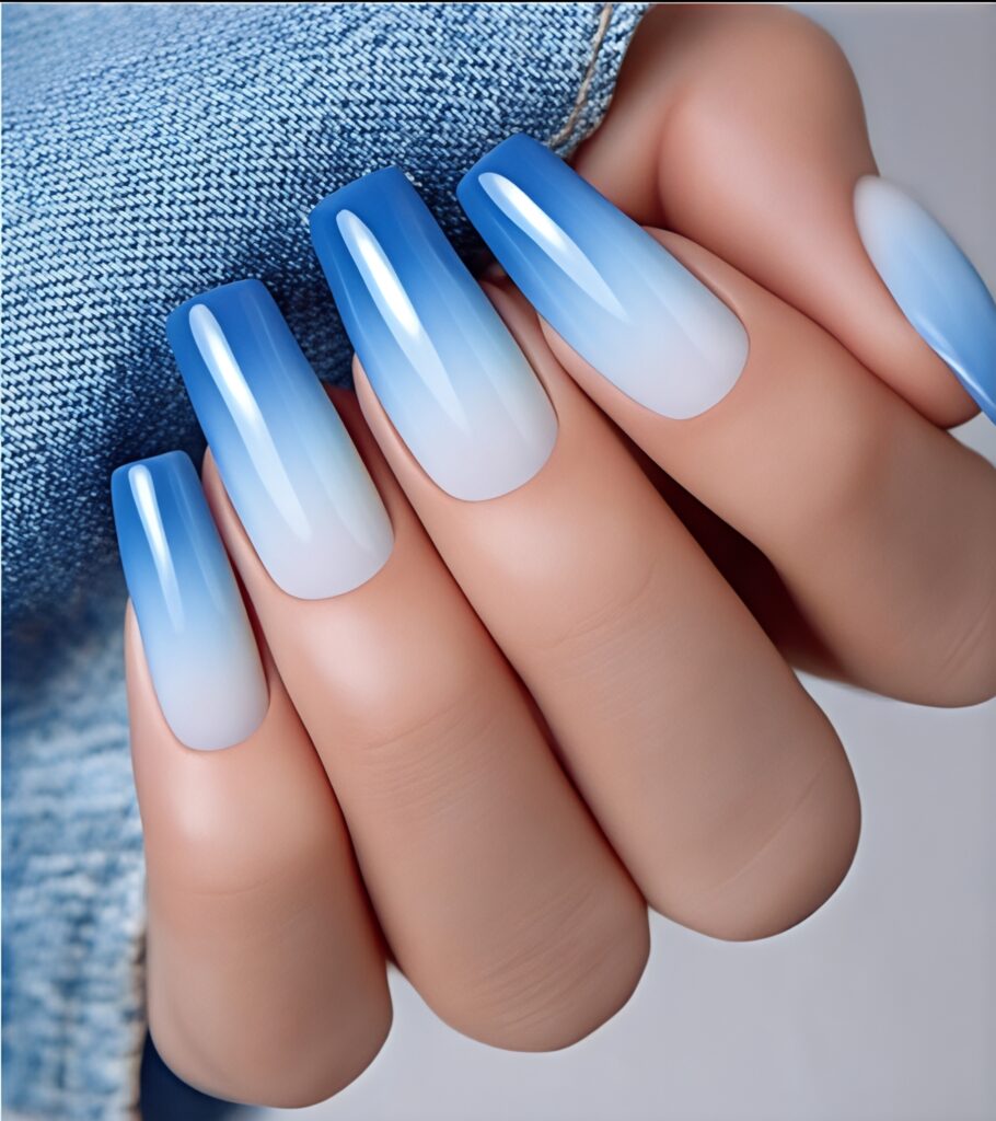 Pastel Ombre blue mirror shine nails look modern and trendy. The soft blue color is combined with a chrome or mirror effect that makes the nails shine like glass. When sunlight touches them they reflect beautifully. This design feels cool and fresh for summer. It is perfect for beach days and vacations. If you like shiny and eye-catching nails this style will definitely grab attention.