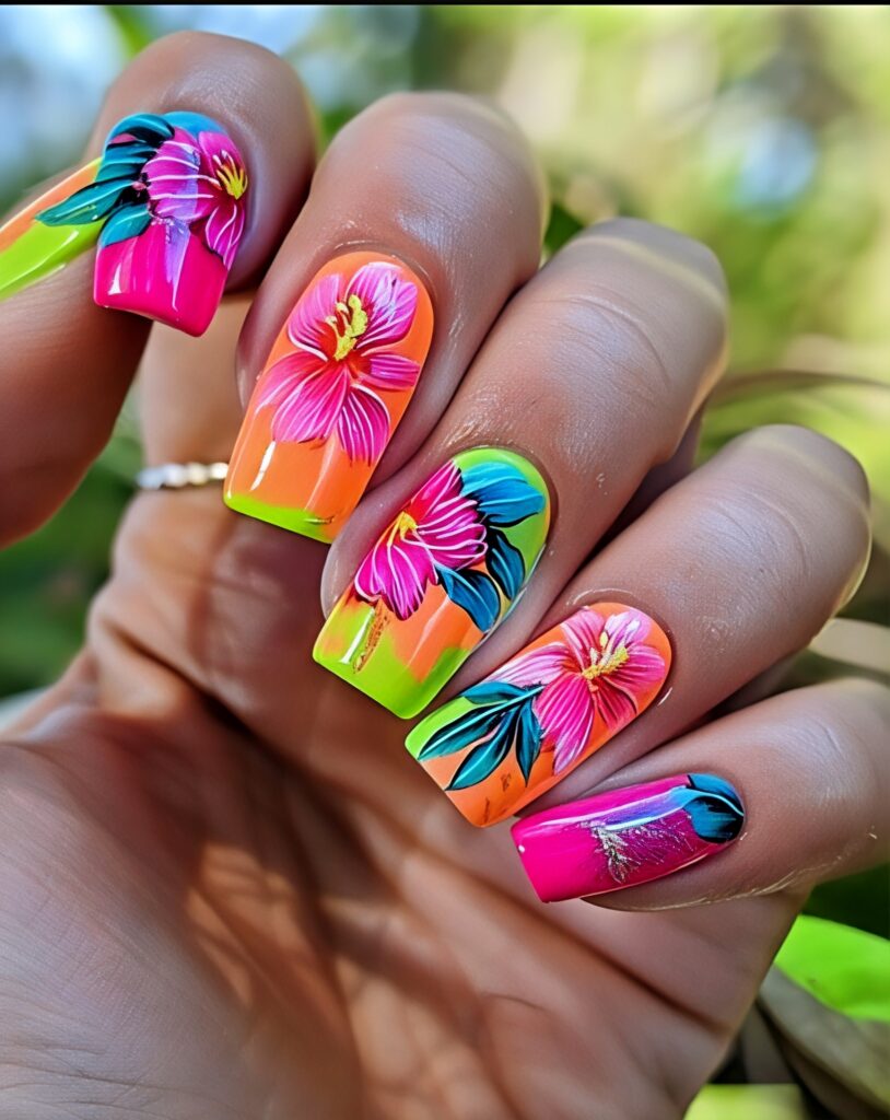 This design is full of bright tropical colors like orange, pink and yellow. These shades are blended together to look like a sunset. On top of that bold flower designs are painted in white or bright colors. The short coffin shape keeps the look neat but still stylish. This nail art feels happy and full of life. It is perfect for beach trips, summer vacations and fun holiday pictures.